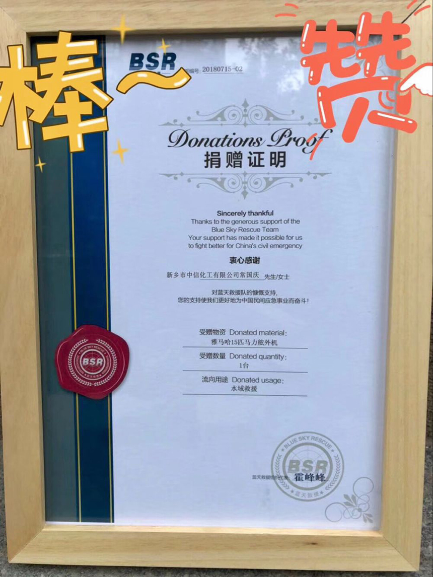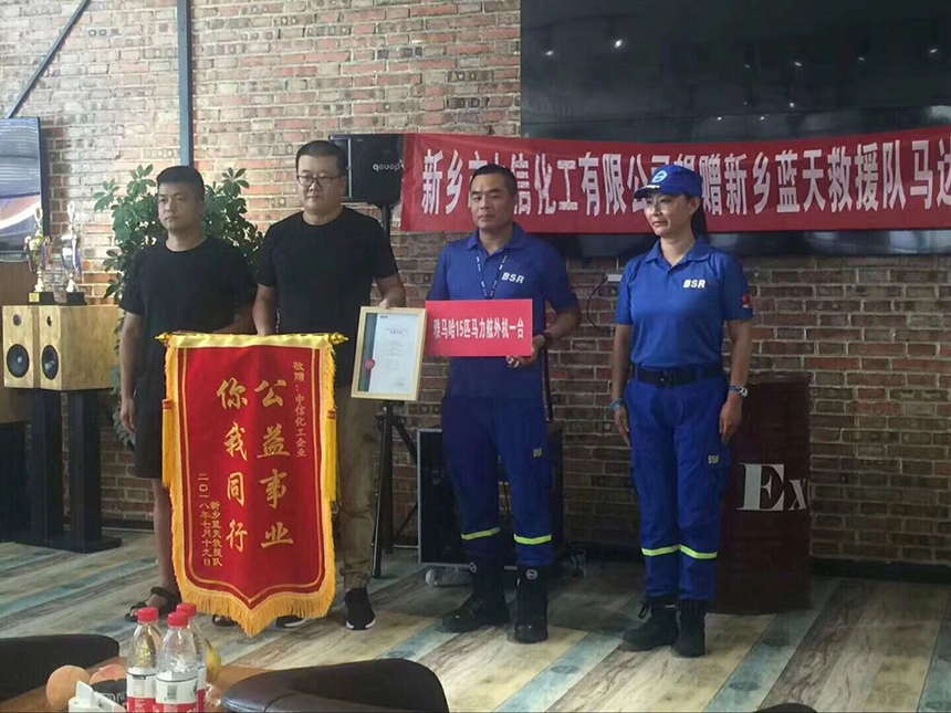 感恩生命,感恩生命中有您。中信化工一直心系社會,堅持社會公益,此次中信領(lǐng)導(dǎo)層來到新鄉(xiāng)藍(lán)天救援隊,向救援隊捐贈雅馬哈15匹馬力舷外機,幫助救援隊更好的水上救援。